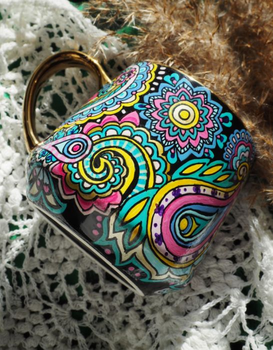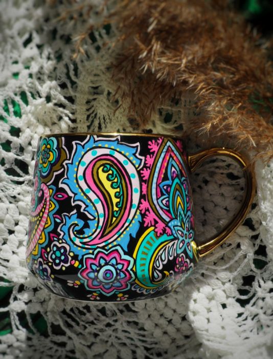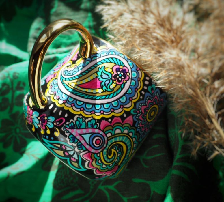 Ręcznie malowany kubek w tureckie wzory paisley doda kolorów Twoim posiłkom, będzie miłym akcentem na biurku w pracy, to też doskonały podarunek dla osoby ceniącej rękodzieło.