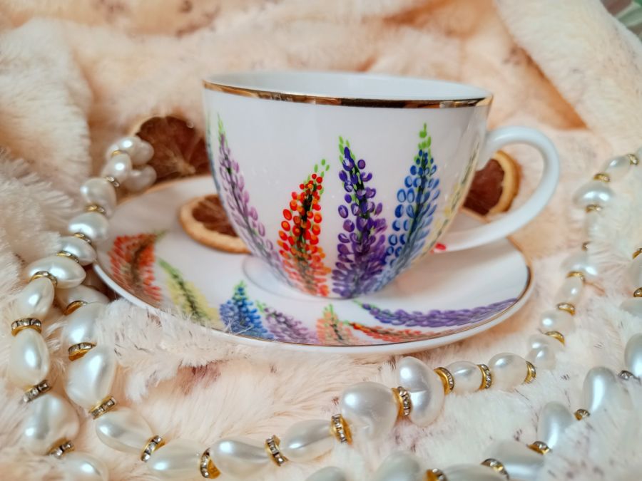 Ręcznie malowany komplet z barwnym łubinem to przepiękna kompozycja dla wrażliwych i delikatnych dusz.