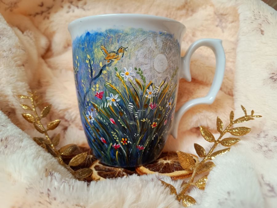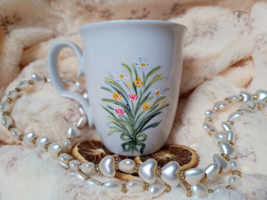 Kubek malowany wiele godzin z wielką troską o wszelkie szczegóły z miłości do natury, z miłości do tego co piękne i ulotne..