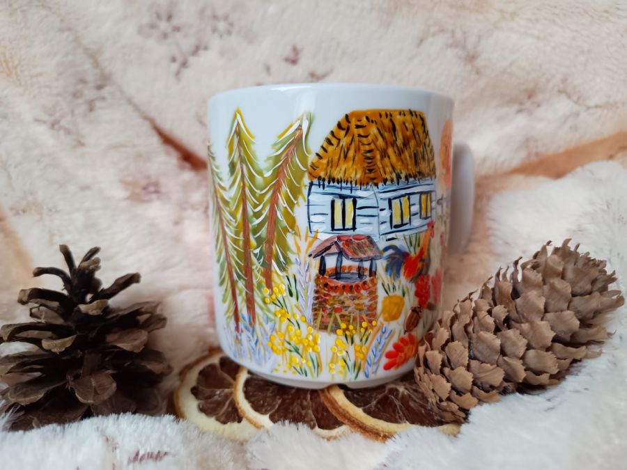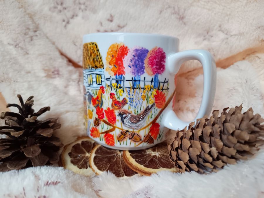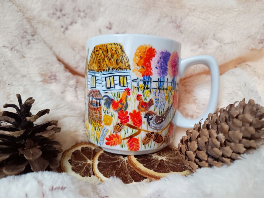 Wiejski kubek z podwórkiem z ziołami, wrotyczem, barwnymi drzewami, sentymentalną chatką, kogucikiem i kurką, mazurkiem i owocującym dębem.