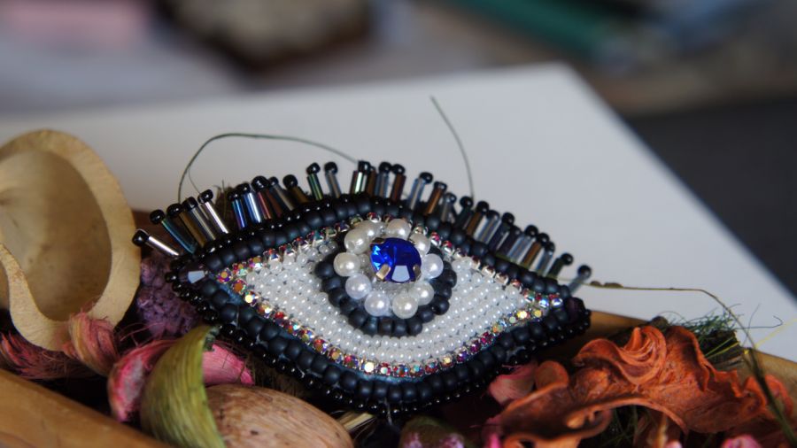 Kiedy zaczynam tworzyć, rzadko mam jakiś konkretny plan – wszystko ujawnia się w trakcie pracy. Czasami po prostu biorę kawałek filcu, kamień, igłę… i nie mam pojęcia, co z tego powstanie. Często najpierw przyszywam pierwszy koralik lub kryształ, a potem buduję coś wokół niego, aż zaczyna wyłaniać się jakiś kształt. Zazwyczaj jest to kwiat – ale tym razem powstało oko. Złe oko.