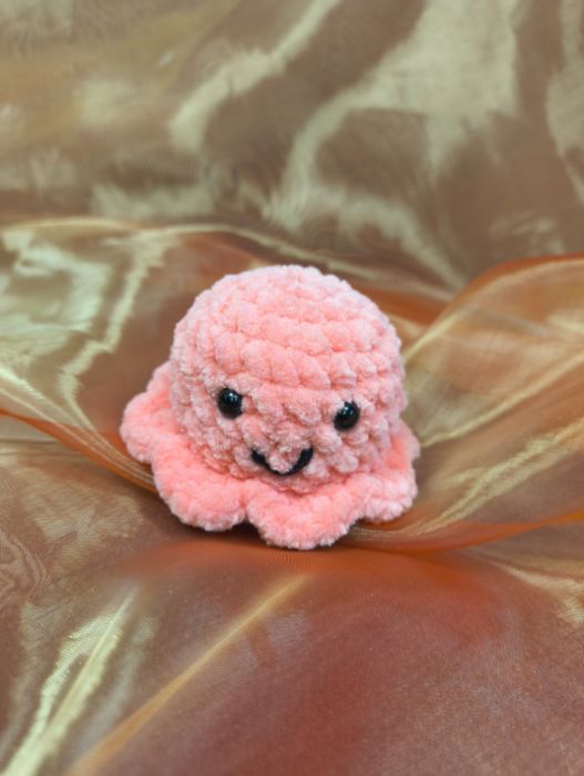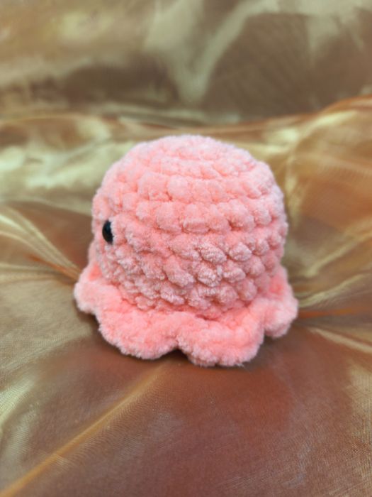 Urocza meduza amigurumi wykonana ręcznie z miękkiej, pluszowej włóczki. Maskotka jest przyjemna w dotyku, starannie wykończona i posiada bezpieczne oczka oraz haftowany uśmiech, który nadaje jej wyjątkowo sympatyczny charakter.