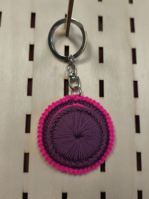 Zadaj pytanie dotyczące produktu: Ręcznie robiony brelok – mini kapelusz szydełkowy fioletowo- różowy