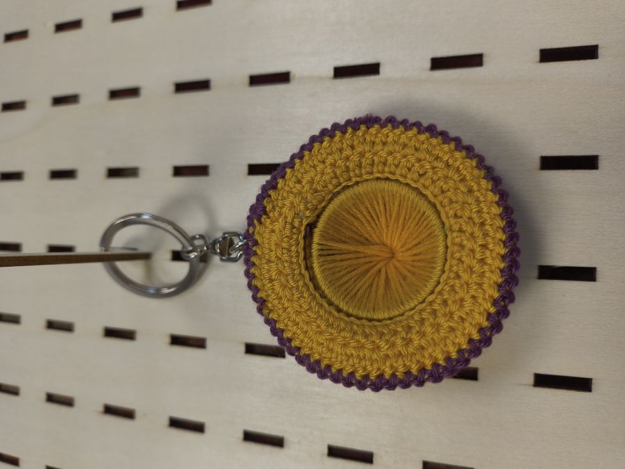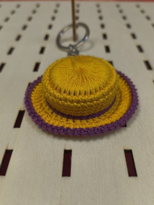 Zadaj pytanie dotyczące produktu: Ręcznie robiony brelok – mini kapelusz szydełkowy żółto- fioletowy