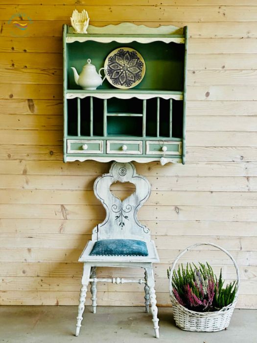 Unikatowa półka, w której piękna niebiesko - szara zieleń została połączone z bielą.