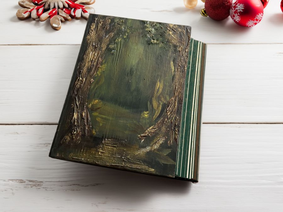 Ręcznie wykonany album z malowaną okładką. Tworzony od podstaw począwszy od własnoręcznie robionej okładki do ręcznie postarzanych i wszywanych kartek.