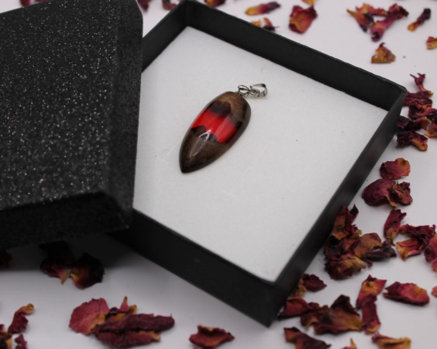 Unikatowa zawieszka wykonana ręcznie z naturalnego drewna orzecha amerykańskiego oraz transparentnej żywicy epoksydowej w intensywnym, czerwonym odcieniu. Połączenie ciemnego drewna i żywej barwy żywicy tworzy efektowny kontrast, który przyciąga wzrok i dodaje charakteru każdej stylizacji.