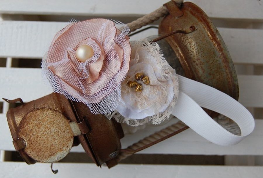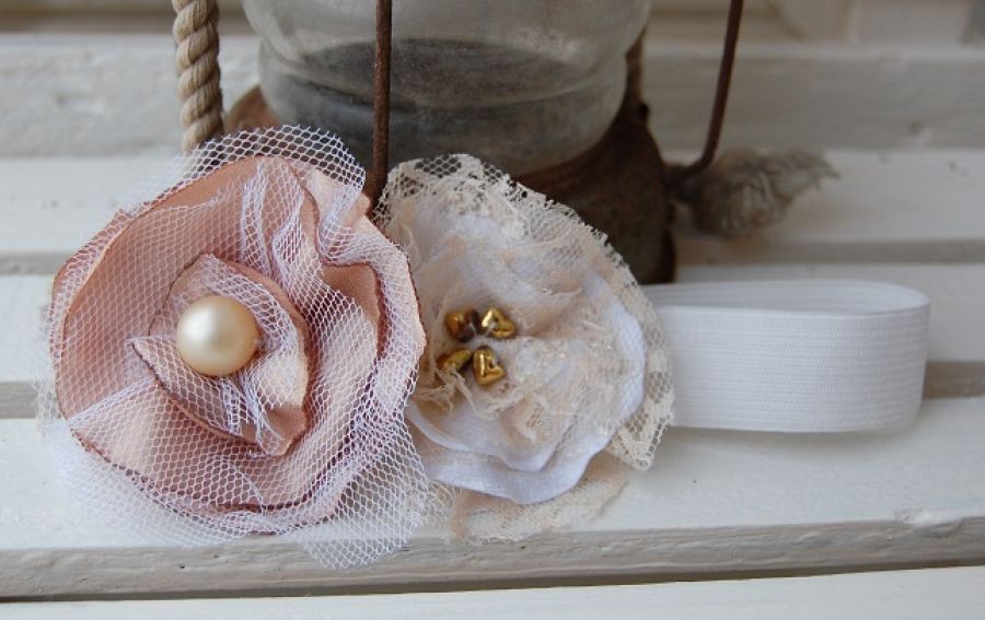 Retro opaska niemowlęca - opaska do włosów ozdobiona dwoma kwiatami w stylu retro. Kwiaty na opasce to wyjątkowa retro odmiana róż w biało beżowej tonacji. Wykonane z białej i beżowej satyny, białego tiulu i beżowej koronki, dodatkowo ozdobione dużą perłą i złotymi koralikami-serduszkami. Opaska wykonana na elastycznej, rozciągliwej gumce.