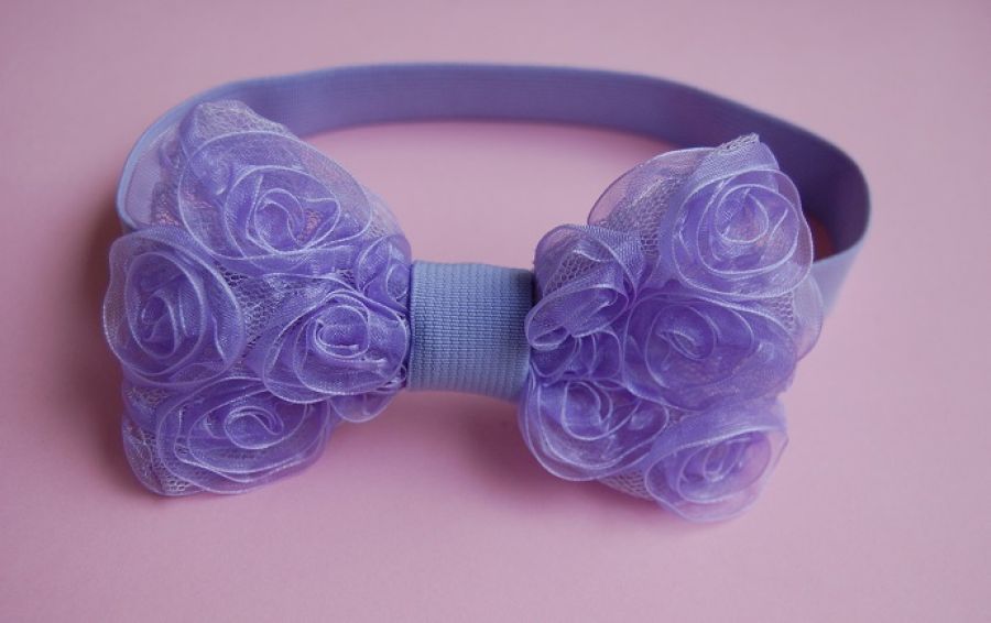 Opaska niemowlęca "Retro kokarda w fiolecie" - opaska do włosów, ozdobiona kokardą z tiulu z naszytymi kwiatami z organzy. Opaska wykonana na fioletowej, rozciągliwej gumeczce.