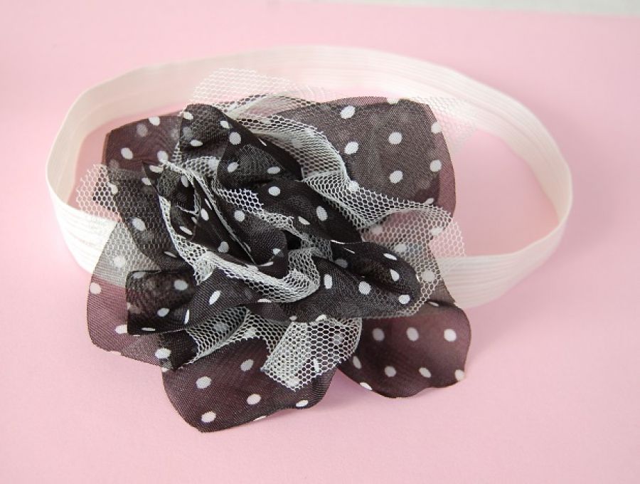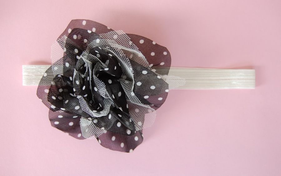 Retro opaska niemowlęca - opaska do włosów ozdobiona kwiatem w stylu retro. Kwiat na opasce to wyjątkowa retro odmiana przestrzennej róży w granatowo-białej tonacji. Wykonany z granatowego szyfonu w białe groszki i białego tiulu. Opaska wykonana na elastycznej, bardzo rozciągliwej gumeczce.