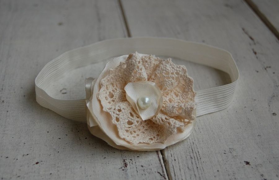 Retro opaska niemowlęca - opaska do włosów ozdobiona kwiatem w stylu retro. Kwiat na opasce to wyjątkowa retro odmiana róży w kremowej tonacji. Wykonany z satyny, koronki bawełnianej, dodatkowo ozdobiony perłą. Brzegi tkaniny zabezpieczone termicznie przed strzępieniem. Opaska wykonana na elastycznej, bardzo rozciągliwej gumeczce w kolorze ecri.