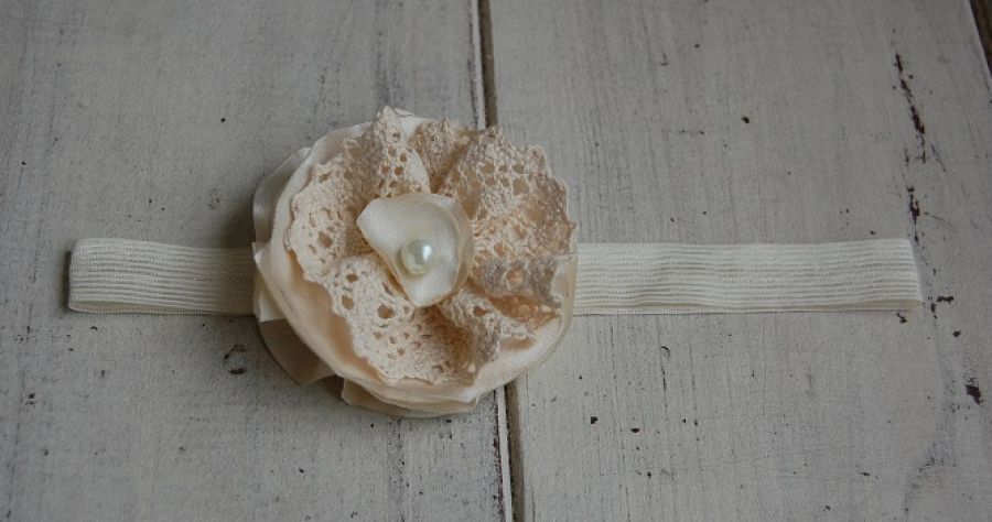 Retro opaska niemowlęca - opaska do włosów ozdobiona kwiatem w stylu retro. Kwiat na opasce to wyjątkowa retro odmiana róży w kremowej tonacji. Wykonany z satyny, koronki bawełnianej, dodatkowo ozdobiony perłą. Brzegi tkaniny zabezpieczone termicznie przed strzępieniem. Opaska wykonana na elastycznej, bardzo rozciągliwej gumeczce w kolorze ecri.