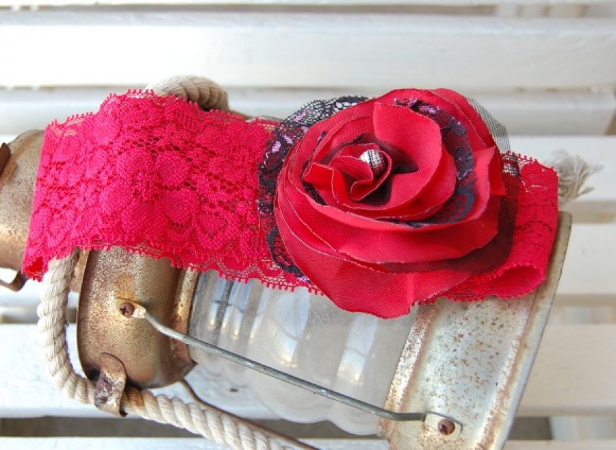 Retro opaska niemowlęca - opaska do włosów ozdobiona kwiatem w stylu retro. Kwiat na opasce to wyjątkowa retro odmiana róży w czerwono-czarnej tonacji. Wykonany z czerwonej tkaniny, czarnej koronki bieliźnianej i tiulu, dodatkowo ozdobiony srebrnym vintagowym koralikiem. Brzegi płatków z tkaniny zabezpieczone termicznie przed strzępieniem. Opaska wykonana na elastycznej, rozciągliwej gumokoronce - podkreślającej klimat retro.