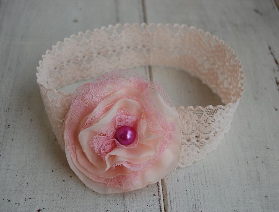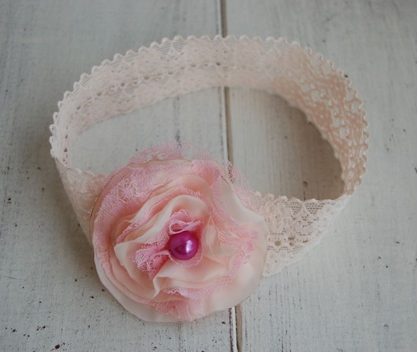 Retro opaska niemowlęca - opaska do włosów ozdobiona kwiatem w stylu retro. Kwiat na opasce to wyjątkowa retro odmiana róży w różowo-beżowej tonacji. Wykonany z satyny o delikatnym beżowym odcieniu, różowej koronki, dodatkowo ozdobiony dużym kontrastowym koralem. Opaska wykonana na elastycznej, rozciągliwej gumokoronce - podkreślającej klimat retro.