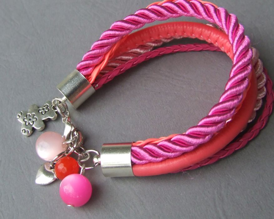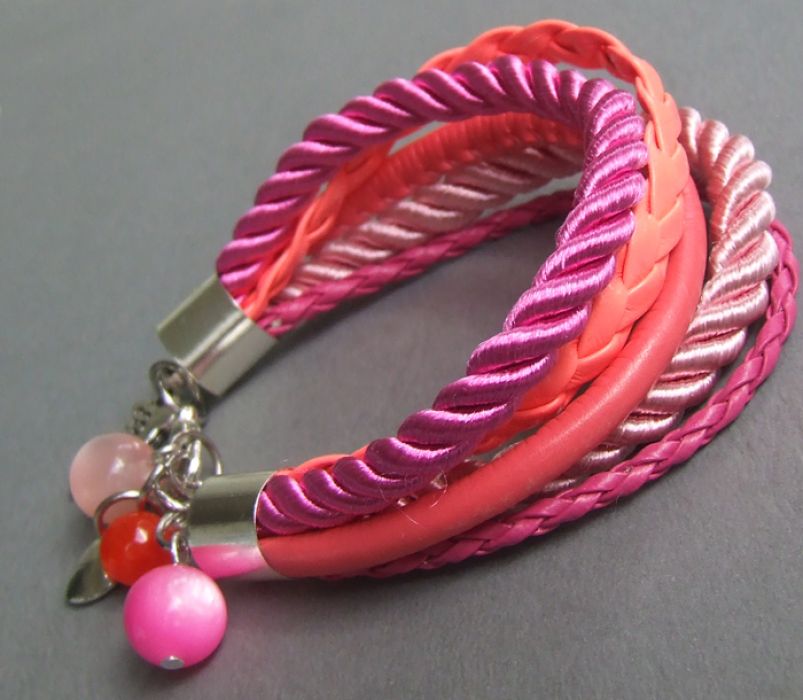 Przedmiotem sprzedaży jest jedna różowa bransoletka stworzona ze sznurków i rzemieni w kilku odcieniach.