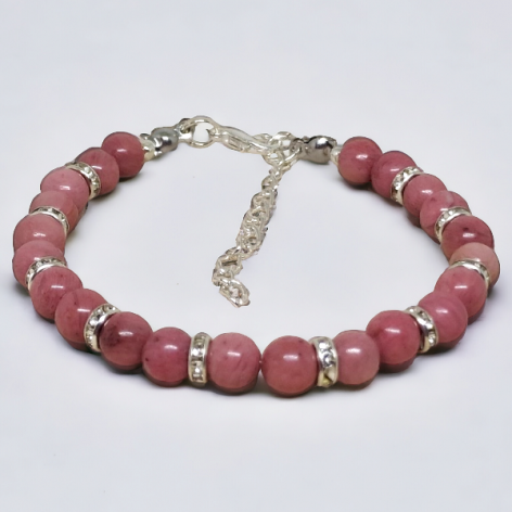 Subtelna bransoletka z naturalnego wysokiej jakości rodonitu o długości 16 cm z łańcuszkiem który pozwala na poszerzenie bransoletki do potrzebnego rozmiaru.Bransoletka wykonana na mocnej lince jubilerskiej starannie i solidnie wykonana .Wyjątkowa nadaje stylu i charakteru