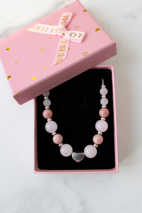 Bransoletka ‘All About Love’ w delikatnym różowym kolorze z naturalnych kamieni na szarym regulowanym sznurku (pasuje na nadgarstek od 15 cm).