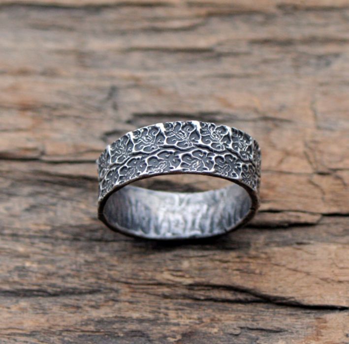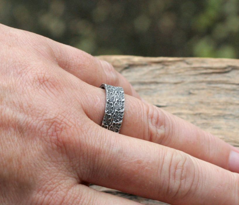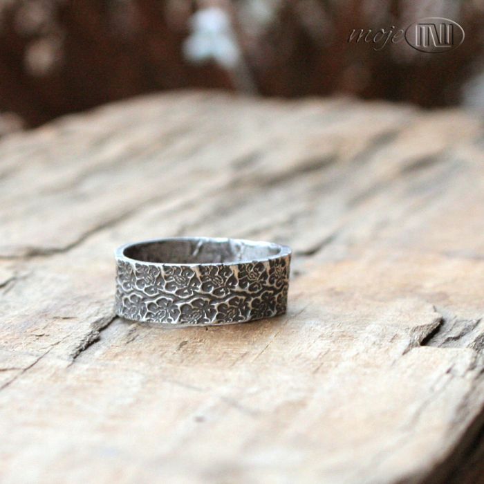 Obrączka z kwietnymi wzorami ze srebra próby min. 925 i wyższej. Jako deseń ozdobny pojawiają się elementy florystyczne. Srebro jest oksydowane i przecierane.