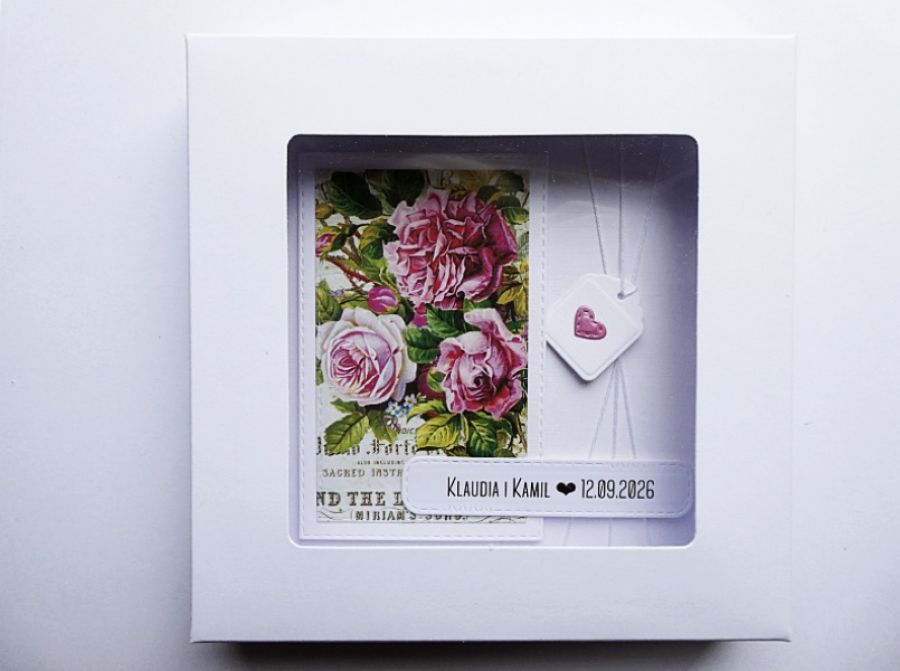 Ręcznie wykonana kartka z okazji ślubu w komplecie z pudełkiem z szybką - romantyczna, elegancka i ponadczasowa.
