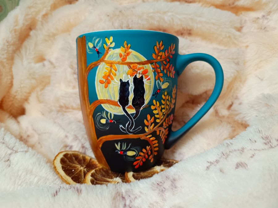 Kubek z zakochanymi kotami w świetle migoczących świetlików i pełni ksiezyca.