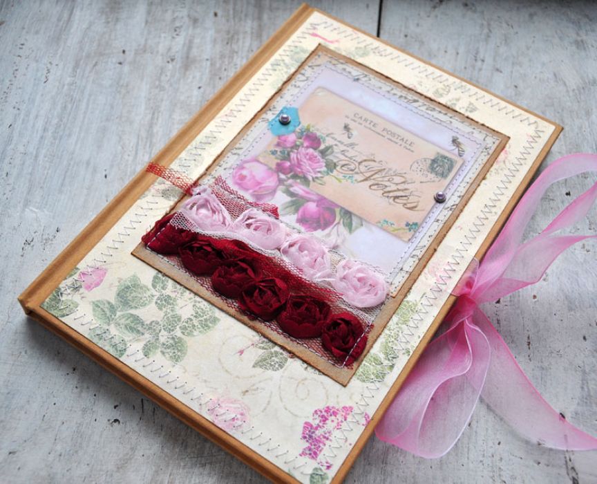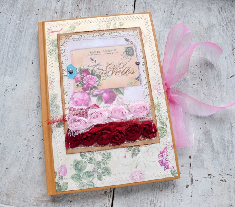 Piękny i romantyczny notes w stylu vintage; ozdobiony metodą scrapbookingu; przeszywany maszynowo, postarzany; na wewnętrznej okładce kieszonka na luźne notatki w której znajduje się dopasowany kolorystycznie tag, zakładka; może stanowić oryginalny prezent; w środku, 100 kartek w szeroką linię; rozmiar A5; zapraszam