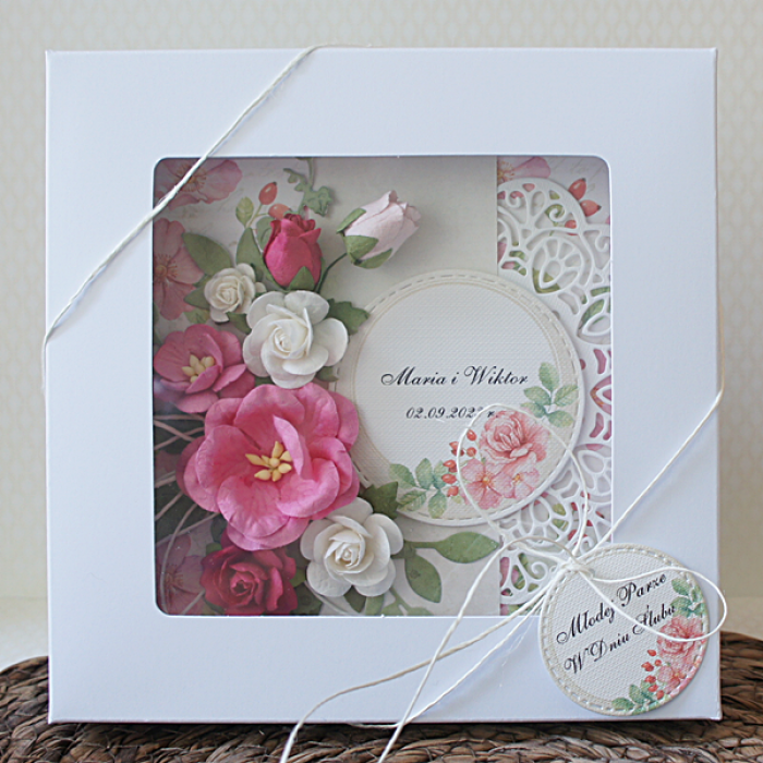Wykonana z wykorzystaniem profesjonalnych materiałów, przestrzennymi papierowymi kwiatami, które tworzą dużą kompozycję kwiatową. W środku przygotowane miejsce na wpisanie życzeń, dedykacji.