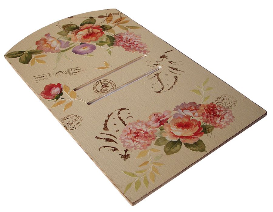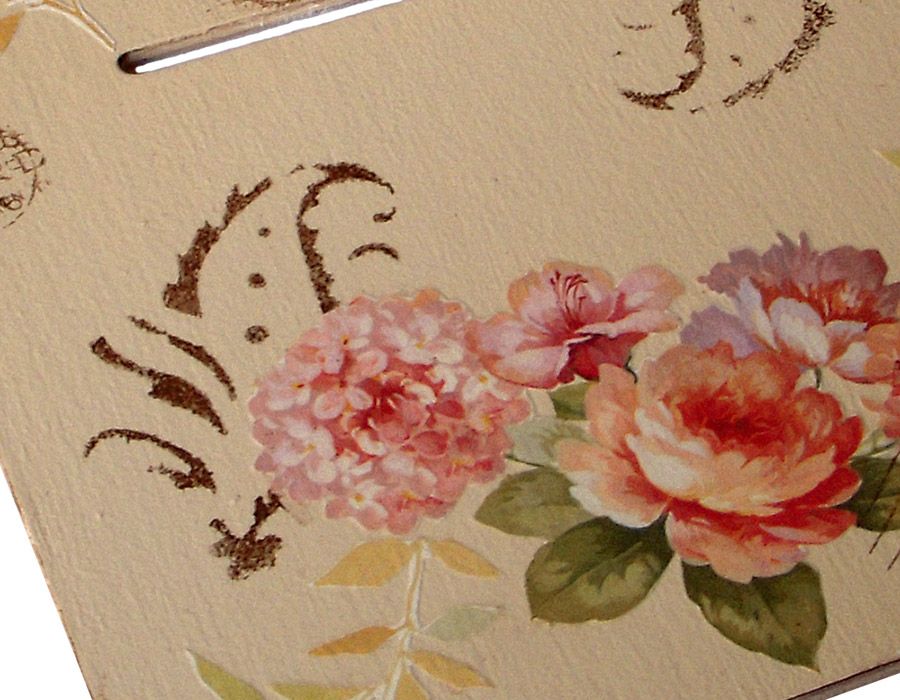 Urocza deseczka pod kalendarz ze zrywanymi kartkami, ozdobiona techniką decoupage i stencil. Utrzymana w ciepłej kolorystyce; tło kremowe, ozdobne stemple i krawędzie - złote. Wielokrotnie pokryta ekologicznym lakierem akrylowym z lekkim połyskiem.