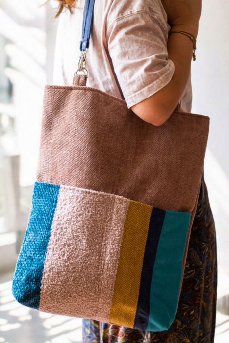 Z przodu dwie kieszenie w stylu patchwork. Całość zapinana na zapięcie magnetyczne.
