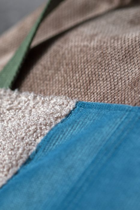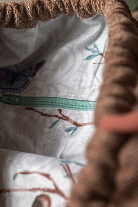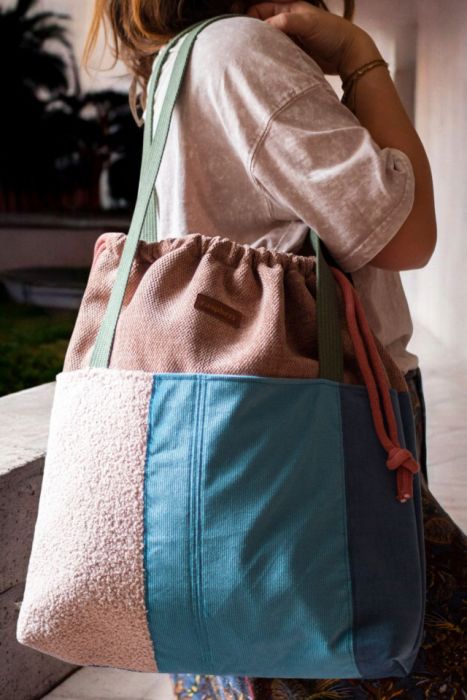 Wykonana z tkaniny w kolorze różowym, z przodu dwie kieszenie z kilku rodzajów kolorowych tkanin. Bawełniane, oliwkowe pasy i jasna, bawełniana podszewka w kwiaty.