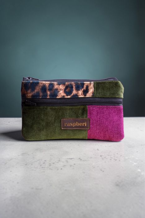 Prosty wodoodporny portfel w kolorze różowo-zielono-grafitowym z dodatkiem weluru w panterkę.