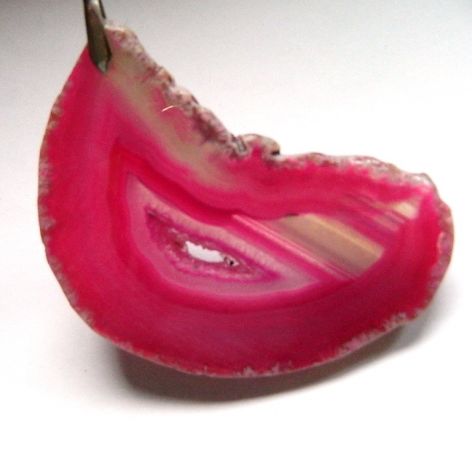 Duży, efektowny kamień w pięknym różowym kolorze, fuksja? Surowa, nieregularna ramka z inkluzjami, a następnie ciemnoróżowy agat z centralnie położoną, niewielką druzą.