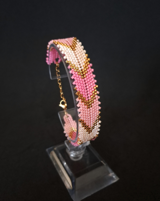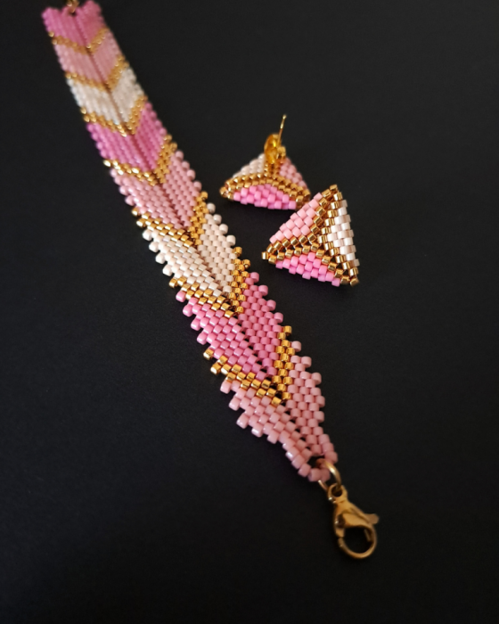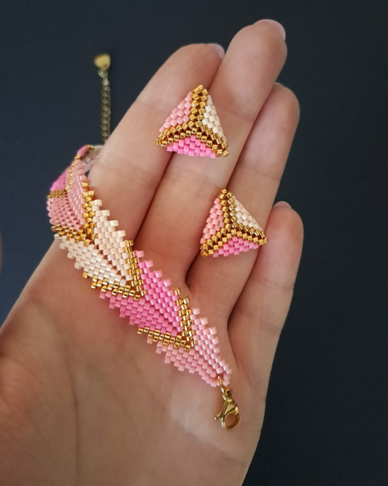 W zestawie znajdziesz klasyczną bransoletkę Pink Chevron oraz geometryczne kolczyki-sztyfty w kształcie trójkątów. Oba elementy zostały wykonane z koralików Miyuki Delica - precyzyjnie, z wyczuciem, ściegiem peyote. Bransoletka jest miękka i elastyczna, kolczyki - lekkie, subtelne, ale z charakterem. Zapięcia są ze stali nierdzewnej w złotym kolorze - trwałe i hipoalergiczne.