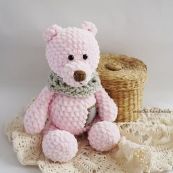 Bardzo mięciutki misio wykonany na szydełku z puszystej różowej włóczki. Ubrany w szaliczek, a na brzuszku urocza łatka.