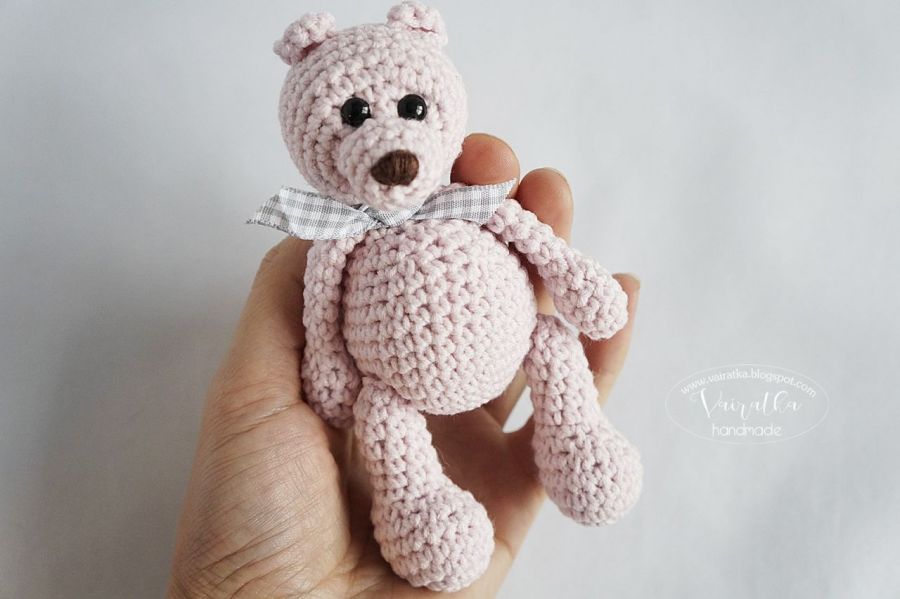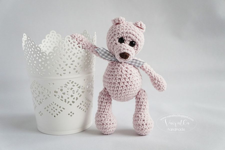 Uroczy miś wykonany ręcznie na szydełku z wysokiej jakości włóczki bawełnianej (nie mechaci się!). Wypełniony antyalergicznym wypełnieniem poliestrowym, wszystkie części ciała solidnie przyszyte, nosek wyhaftowany, a oczy - to tzw. "safety eyes" - nie do wyciągnięcia! Zabawka bezpieczna dla dzieci!