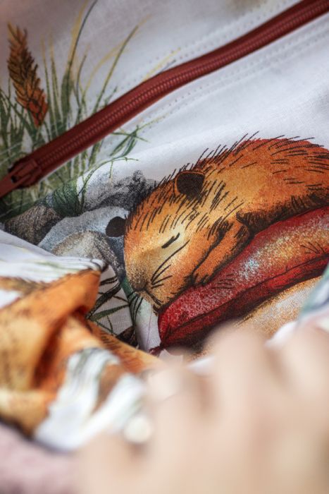 W środku plecak posiada kieszeń zapinaną na suwak. Wykończony jest bawełnianą podszewkę w kapibary.