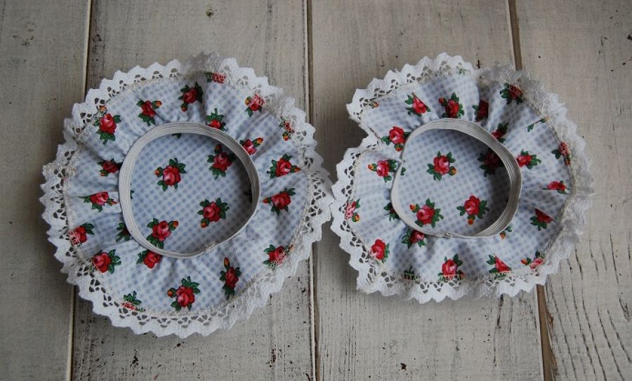 Dekoracyjne kapturki na słoiki z przetworami. Uszyte z tkaniny w niebieską krateczkę z motywem małych różyczek, dookoła wykończone koronką bawełnianą. Od lewej strony wszyta gumka - ułatwiająca zdejmowanie i wkładanie kapturka na słoik. Pasują na zakrętkę o średnicy 8/9cm (słoik litrowy)