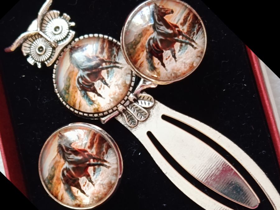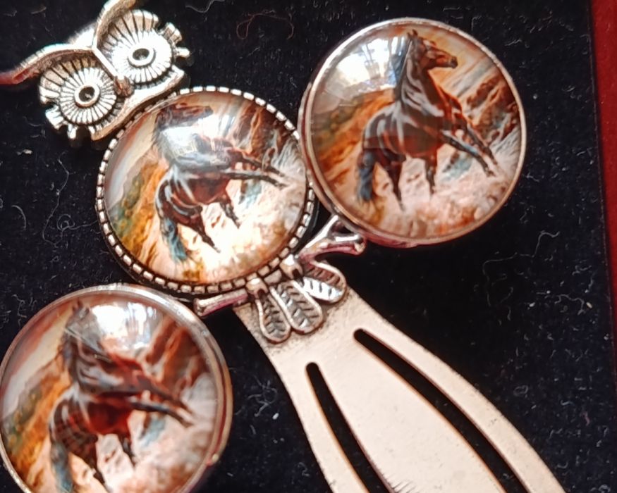 Spinki do mankietów i zakładka do książki - niebanalny prezent dla miłośnika koni, stosownie zapakowany, gotowy do wręczenia.