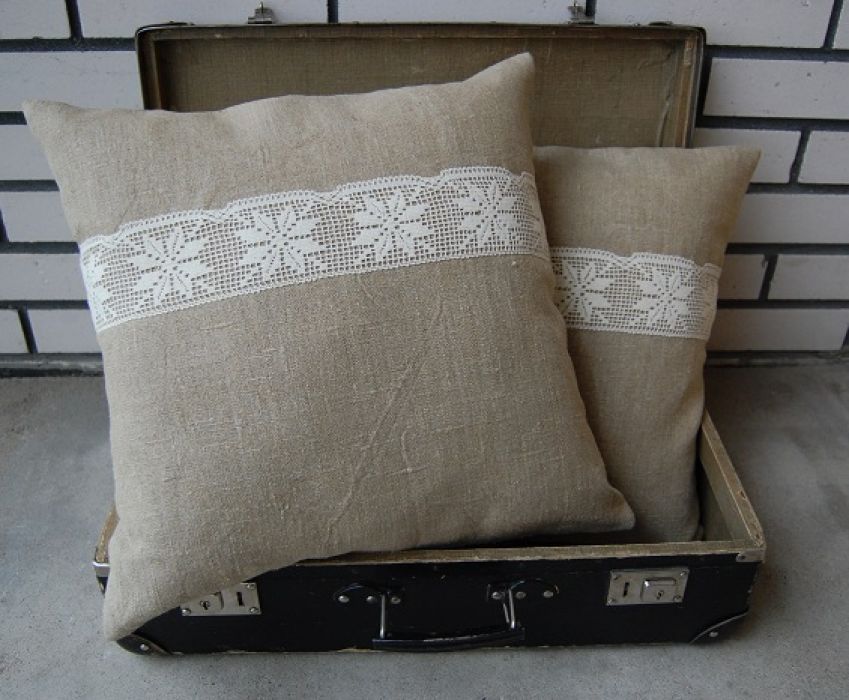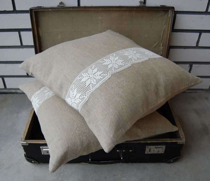 Rustic home - poszewki na poduszki wykonane z grubego, naturalnego lnu. Ozdobione na przodzie szeroką, bawełnianą koronką. Z tyłu zapięcie na zakładkę z dwoma drewnianymi guzikami. Całość utrzymana w rustykalnym, prowansalskim stylu.