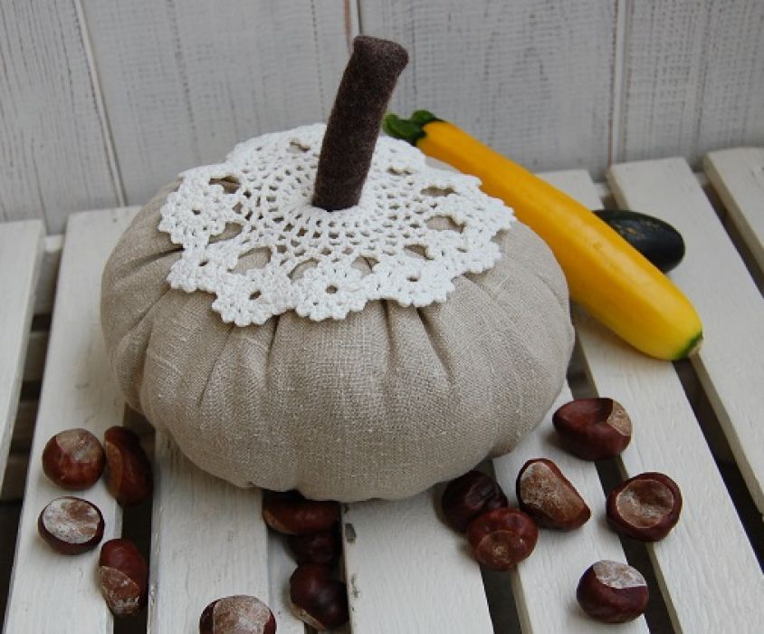 Rustykalna, lniana dynia - wykonana ze 100% lnu, ogonek z filcu, wypełniona kulką silikonową. Góra ozdobiona szydełkową aplikacją. Będzie ciekawą, wielosezonową jesienną dekoracją Twojego stołu, parapetu lub innego miejsca w domu.