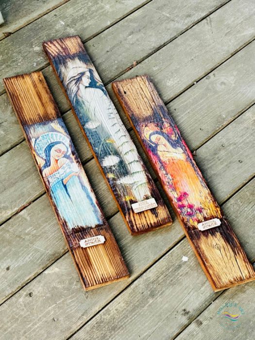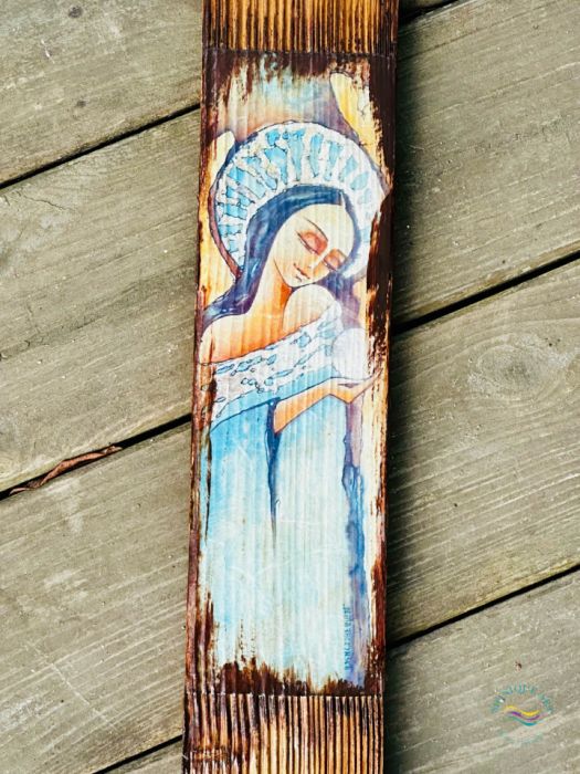 Drewno z historią, zamienione w obraz z aniołem, wnoszący do wnętrza spokój, ciepło i symboliczny wymiar ochrony.