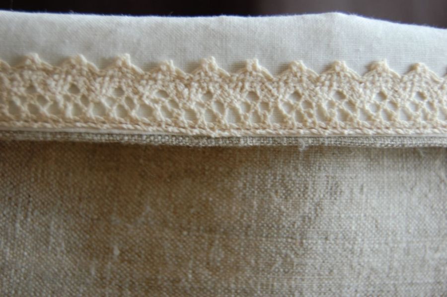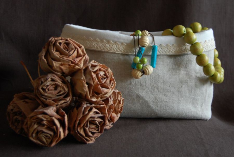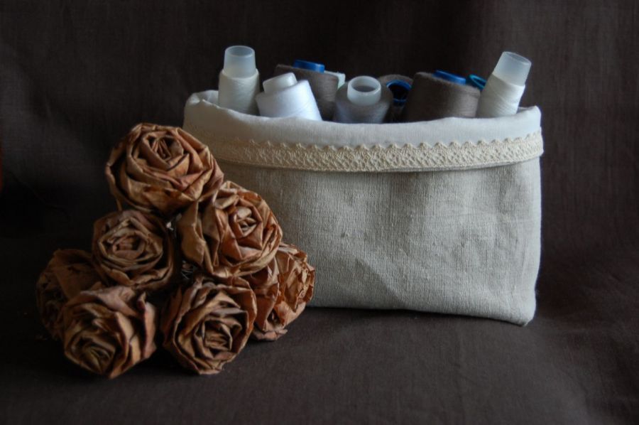 Rustykalny koszyczek, którego zewnętrzna strona wykonana jest z 100% lnu tkanego na krośnie, wnętrze to bawełna w kolorze ecri. Lekko wywijana góra ozdobiona klockową koronką w kolorze ecri.