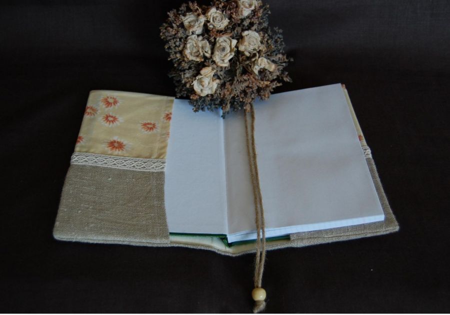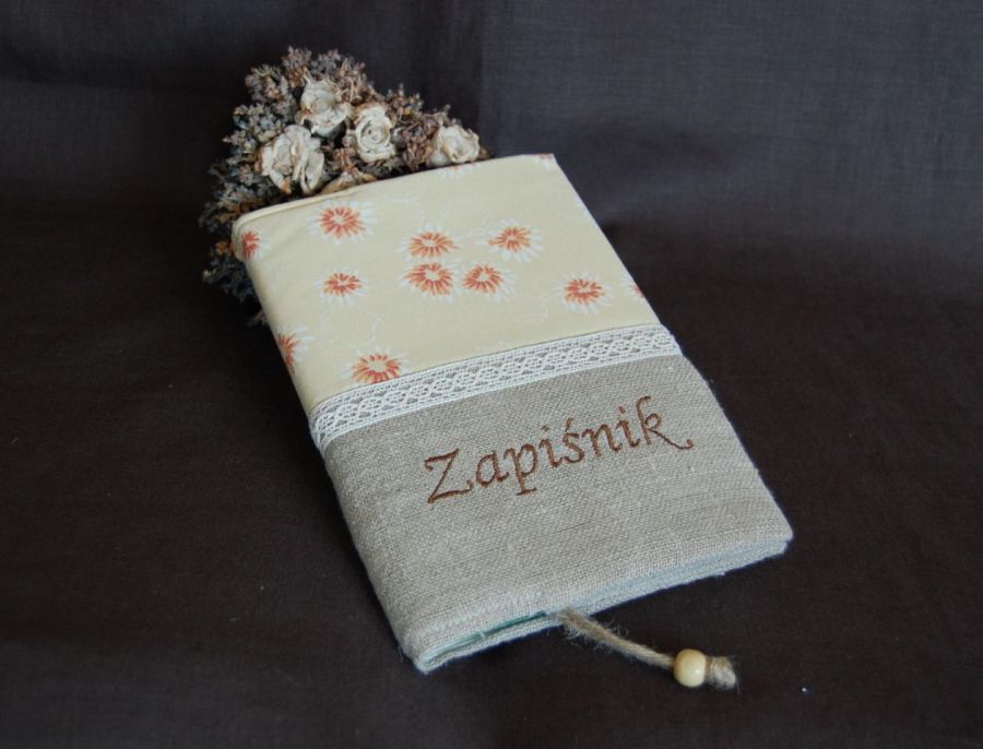 Rustykalny zapiśnik- w jego skład wchodzi brulion 96cio kartkowy w kratkę (format A5) w twardej oprawie oraz lniano-bawełniana okładka.Okładka uszyta z połączenia naturalnego lnu i kwiecistej bawełny, ozdobiona bawełnianą koronką. Na przodzie wyhaftowany (haft maszynowy) brązowy napis "Zapiśnik". (Istnieje możliwość spersonalizowania notesu i wyhaftowania innego napisu, np. "Zapiśnik Zofii").W środek dana ocieplina, przez co okładka jest miękka i puchata, wykończona od lewej strony podszewką. Dodatkowy atut to zakładka ze sznura jutowego, zakończona u dołu drewnianym koralikiem. Okładka nie jest na stałe połączona z zeszytem, w razie zabrudzenia lub zapisania można zdjąć i wyprać, ewentualnie zamówić drugą w innej kolorystyce :-)