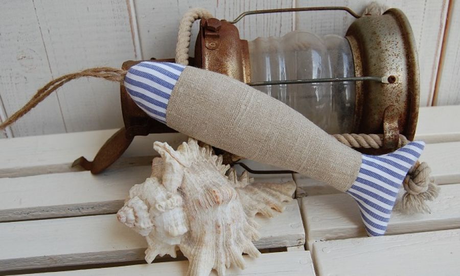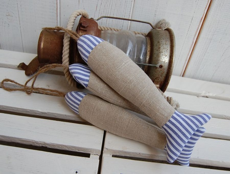 Rybki - ciało rybek zostało wykonane z naturalnego lnu, pyszczki i ogonki z bawełny w paseczki. Wypełnione kulką silikonową. Zawieszka wykonana ze sznura jutowego. Świetnie sprawdzą się jako ozdoba w pomieszczeniach w stylu marine czy rustykalnym.
