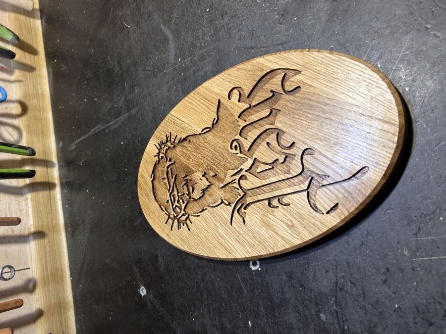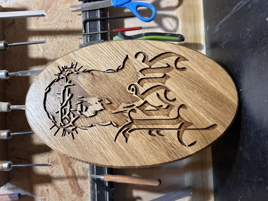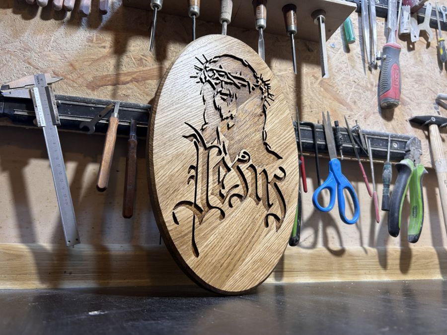 Ręcznie wykonana rzeźba z wizerunkiem Jezusa. Drewno dębowe, wysokość 30 cm.