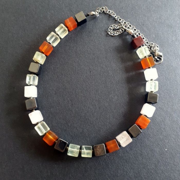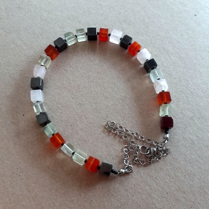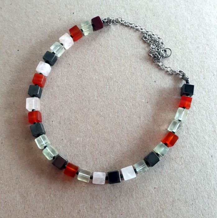 Naszyjnik wykonany z kostek agatu brązowego,bronzytu, kryształu górskiego oraz awanturynu. Kostki mają wymiar 5mm. Długość naszyjnika wynosi 40cm. Łańcuszek oraz zapięcie wykonane są z stali szlachetnej typu 304. Biżuterię wysyłam ozdobnie zapakowaną.