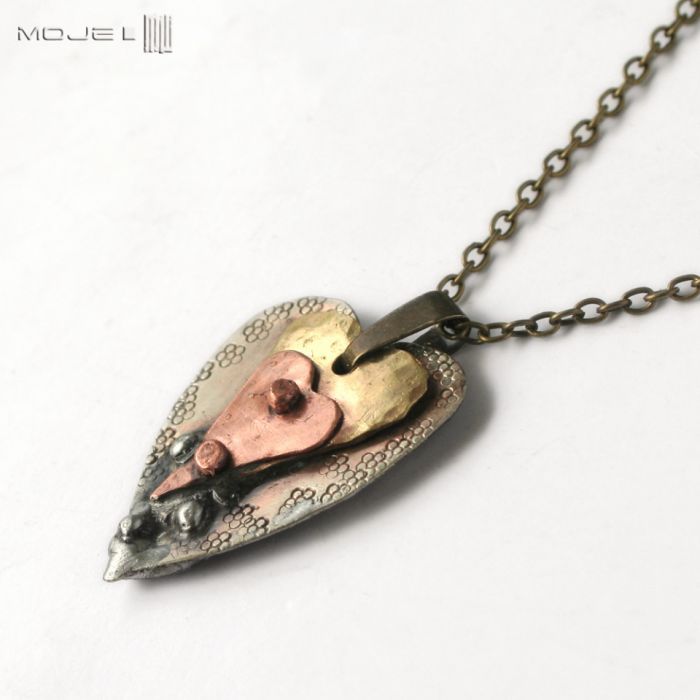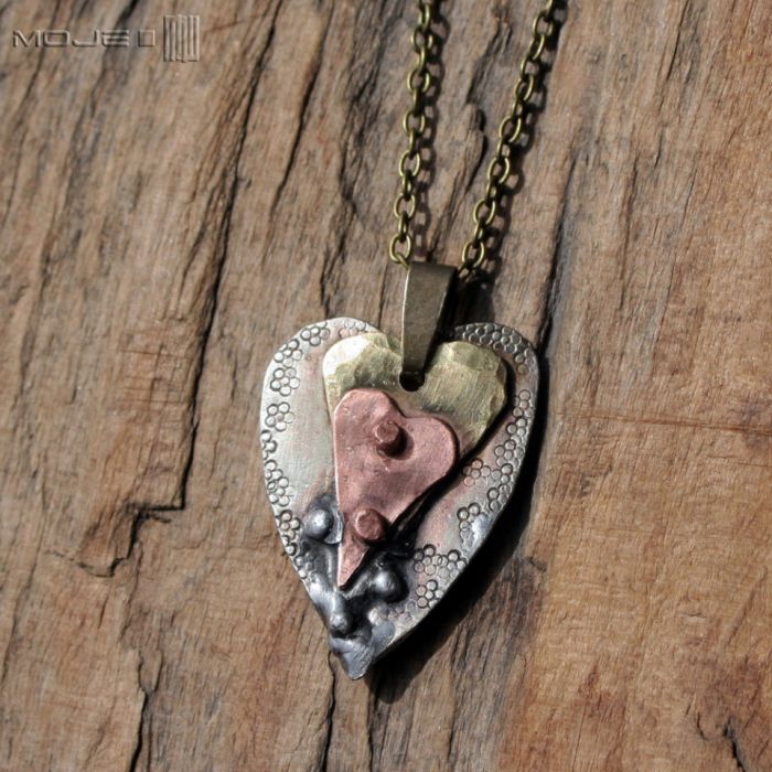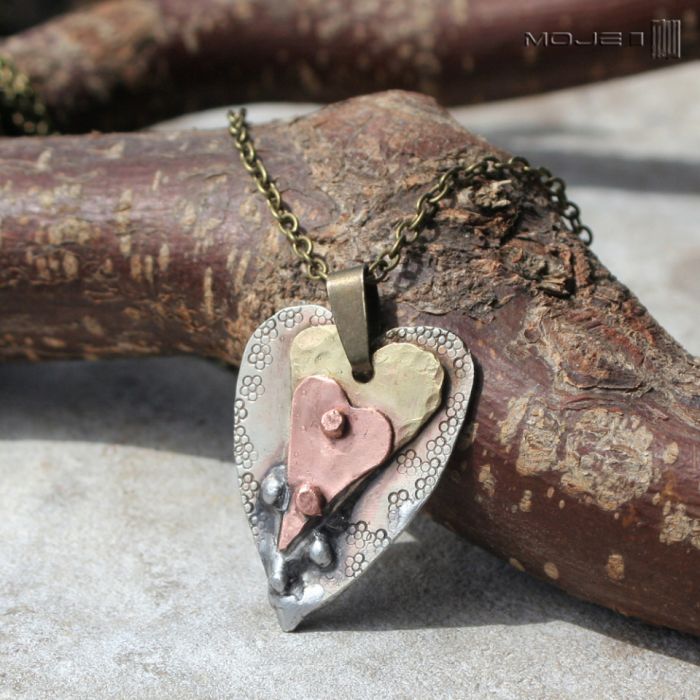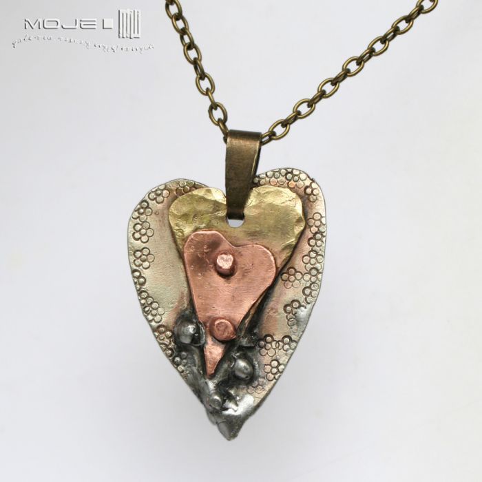 Wisior w kształcie serca z alpaki, mosiądzu i miedzi. Ozdobione jest drobnymi kwiatuszkami, częściowo młotkowane, patynowane i przetarte dla wydobycia faktury.
