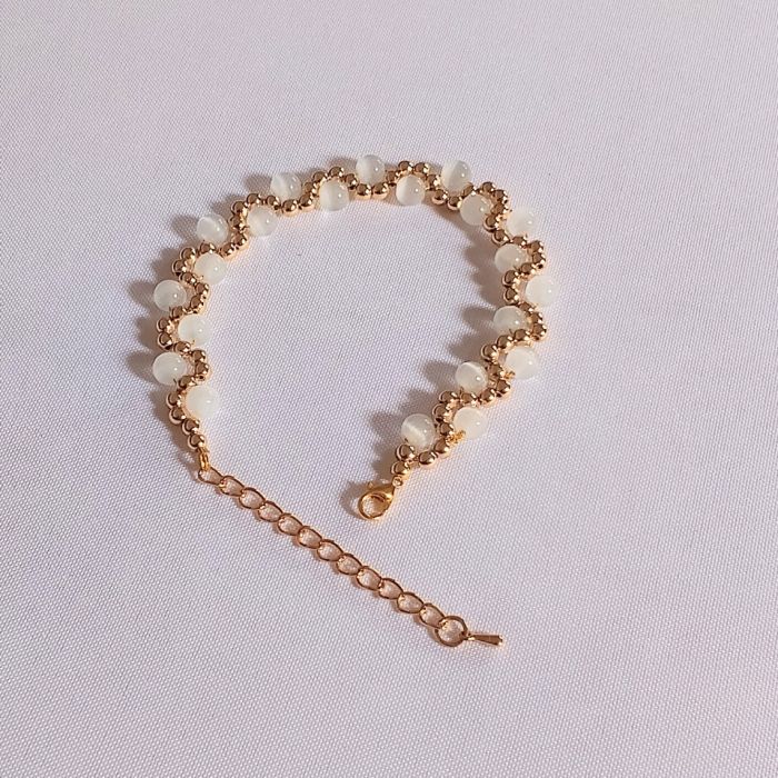 Bransoletka wykonana z kamienia naturalnego Selenitu białego z efektem tygrysiego oka. Oraz kulek hematytu pokrytego złotem.