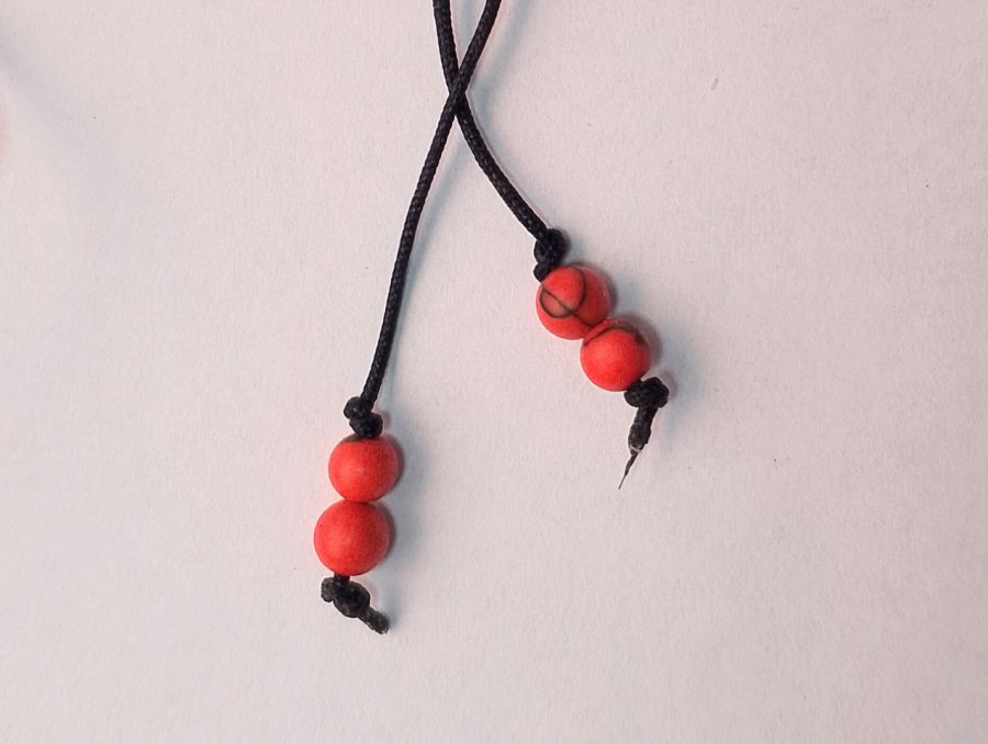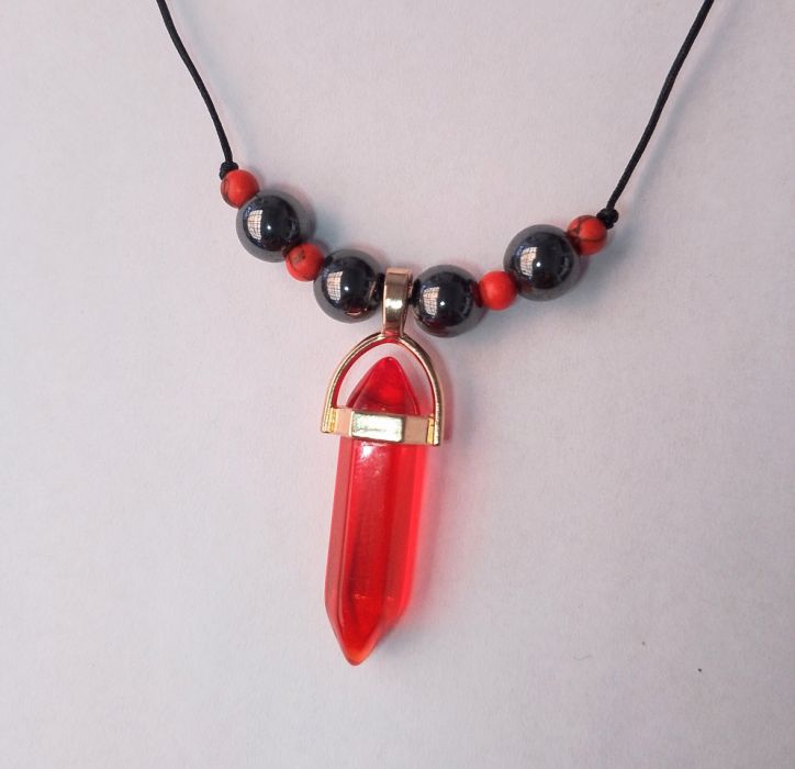 Uroczy naszyjnik typu wisiorek z naturalnych kamieni (czerwony topaz, hematyt i czerwony turkus) Nośnikiem jest sznurek woskowany czarny. Długość kolumny (topaz) 3 cm, szerokość 0,8 cm. kulka hematyt średnica 0,8 cm, turkus czerwony 0,3 cm.