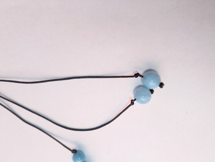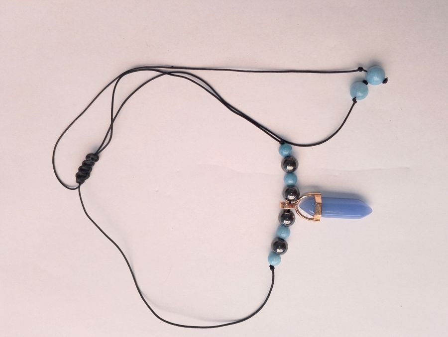 Uroczy naszyjnik typu wisiorek z naturalnych kamieni (Jadeit Lawendowy, Hematyt i Jadeit niebieski ) Nośnikiem jest sznurek woskowany czarny. Długość kolumny (Jadeit Lawendowy) 3 cm, szerokość 0,8 cm. kulka hematyt średnica 0,8 cm, Jadeit niebieski 0,6 cm.