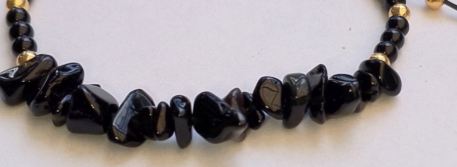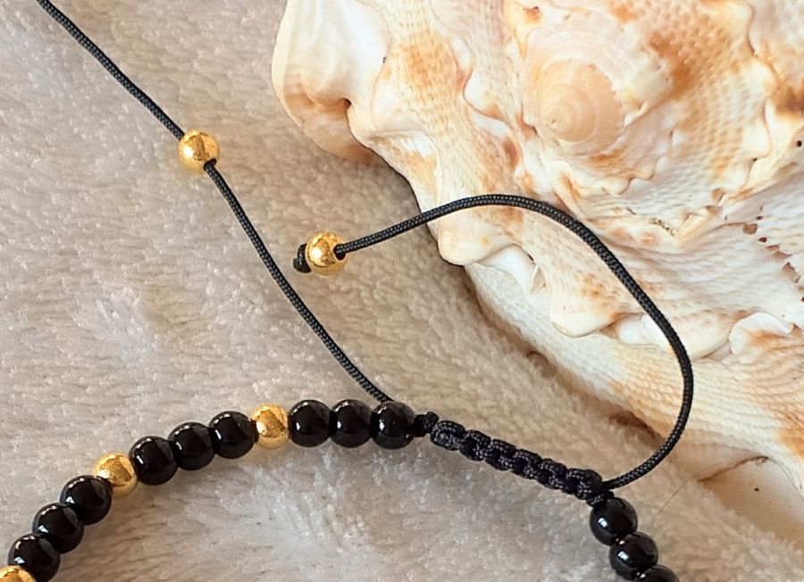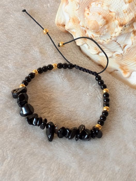 Urocza bransoletka z naturalnego czarnego obsydianu . Nośnikiem jest woskowany sznurek. Bransoletka składa się z dwóch wielkości koralików . Średnica okrągłych koralików to 4 mm .
